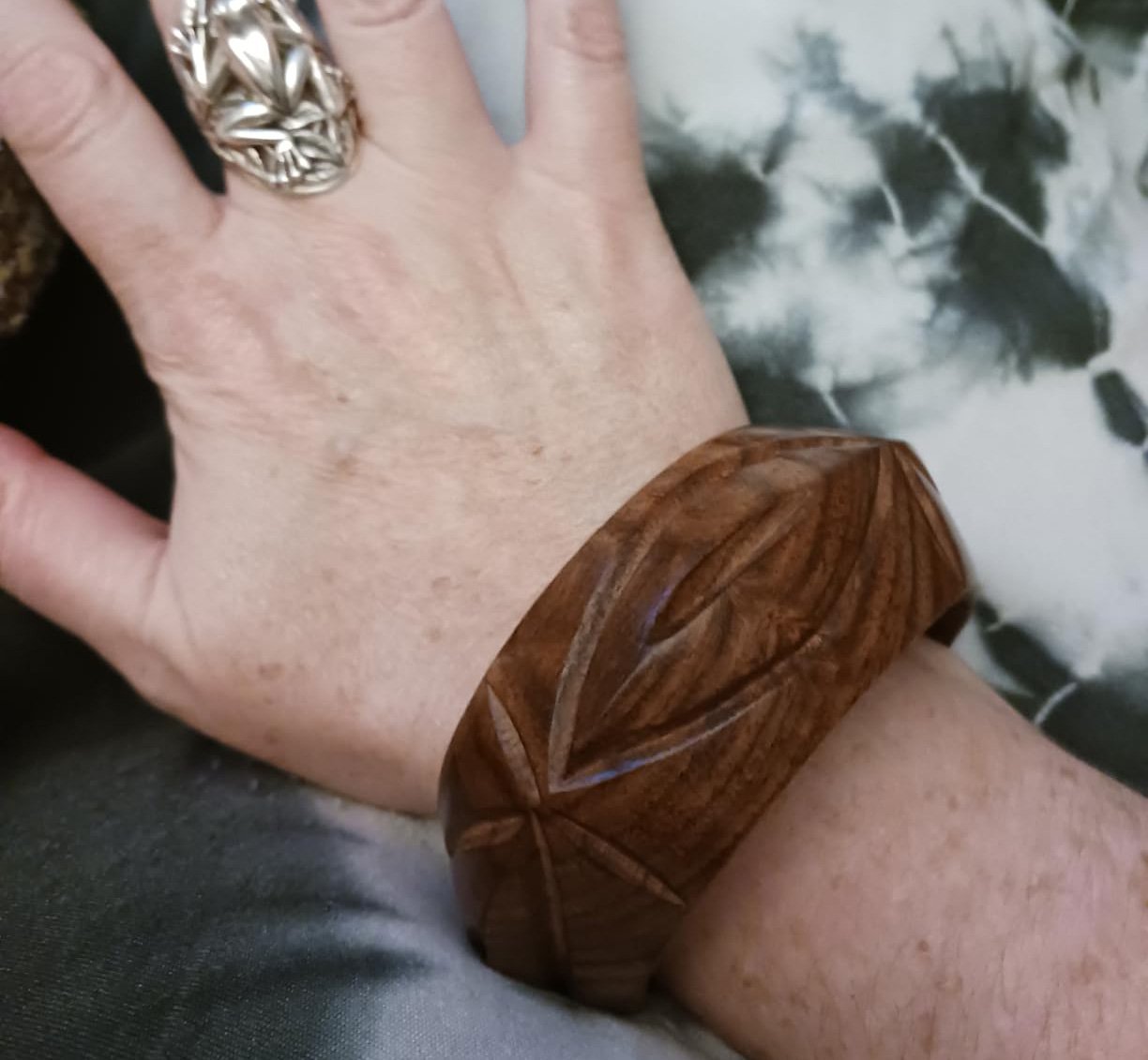 Dark Wood Bangle with Floral Cut-Outs – Ornate Bohemian Bracelet