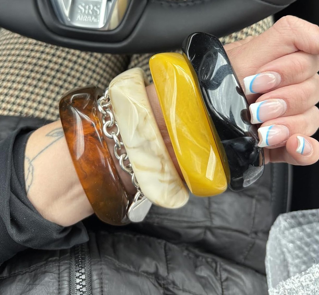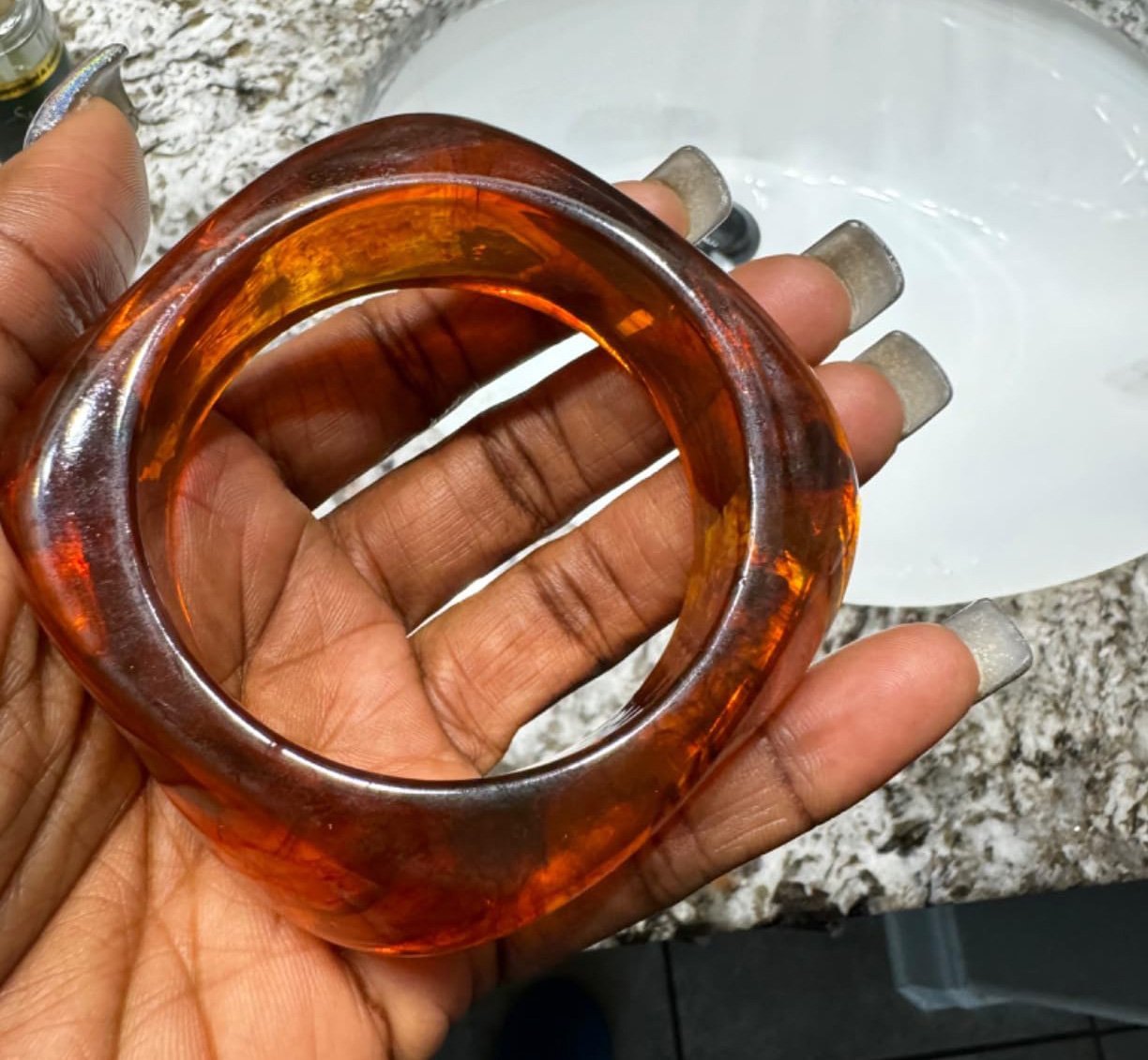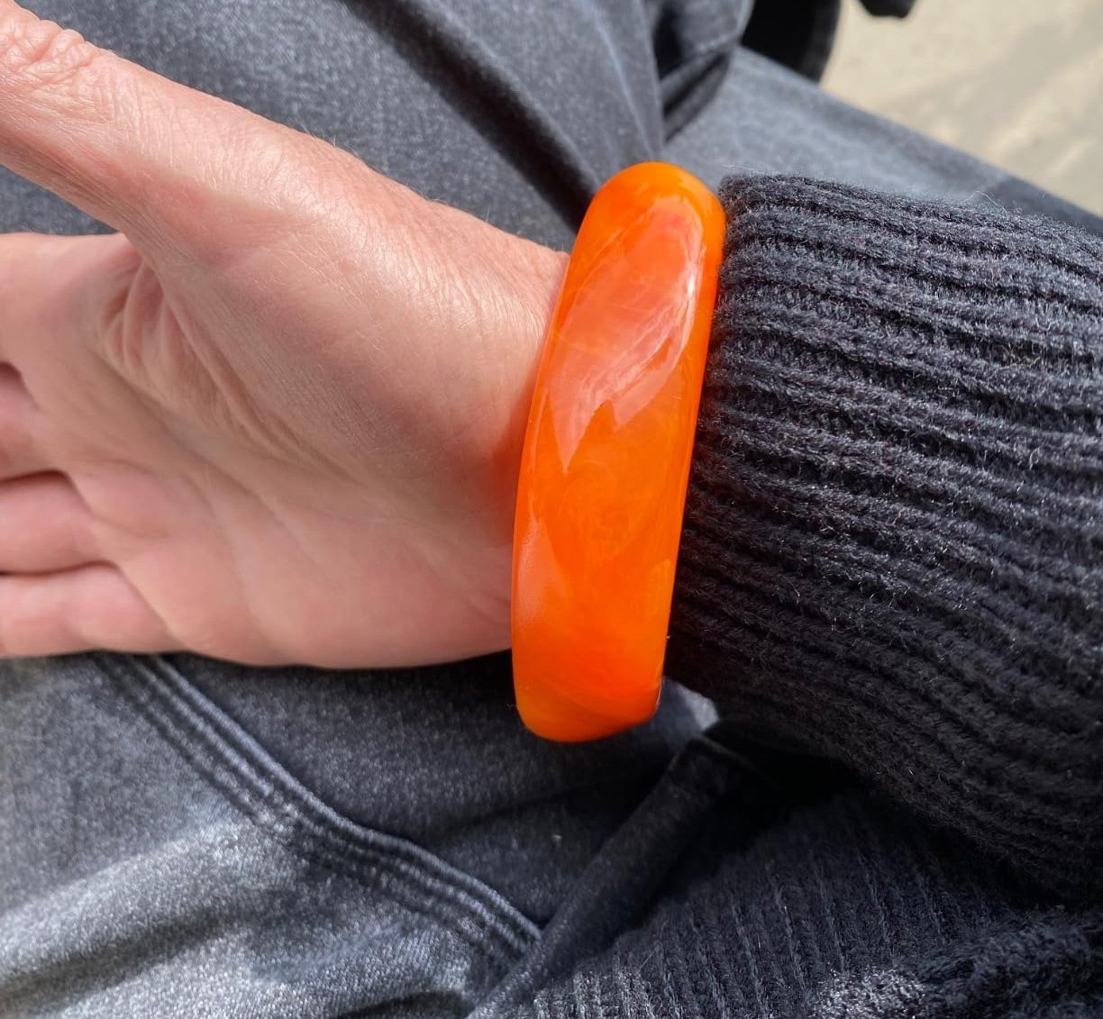 I really love the unique shape and vibrant color of this bangle. The orange resin combines swirled translucent and opaque shades, making it truly eye-catching. It fits snugly—I managed to get it on and off, but it’s a bit tricky, so I’d recommend it for smaller wrists. The inner diameter measures just under 2.5”.
