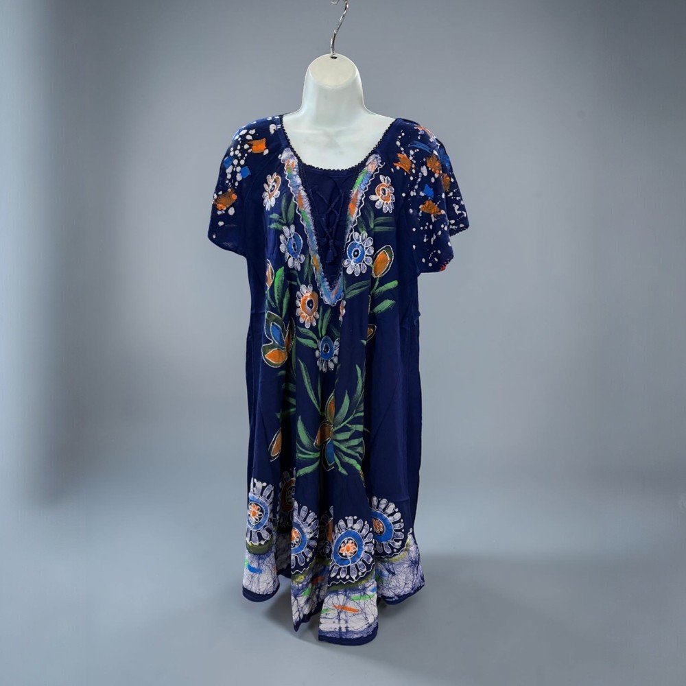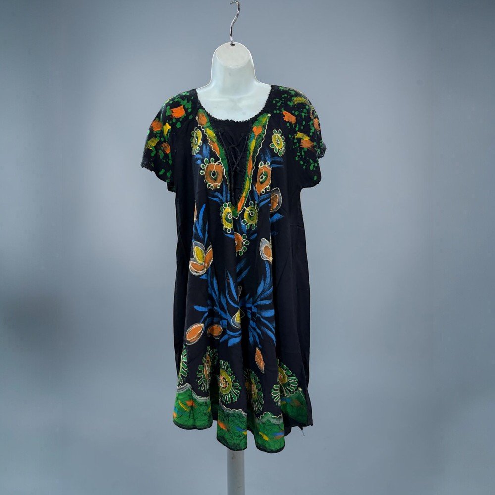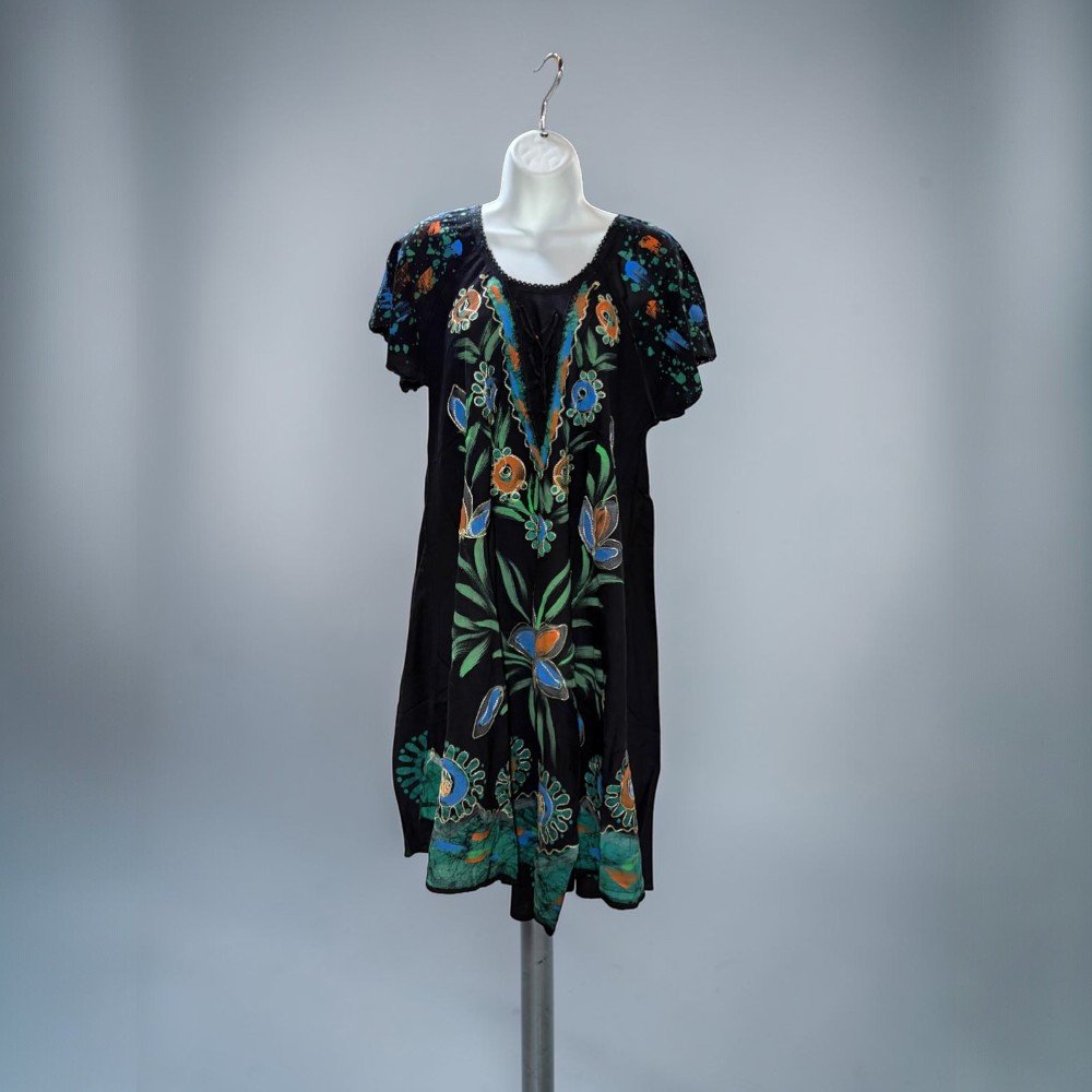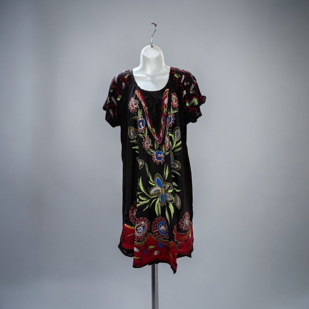 Featuring vibrant embroidered-style floral artwork, this dress combines a soft flowing silhouette with artistic detailing that makes each piece stand out. The lightweight fabric and loose fit make it perfect for warm weather, travel, beach days, or casual everyday wear.
