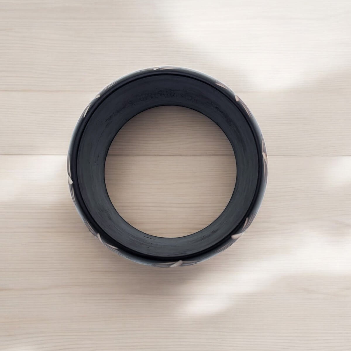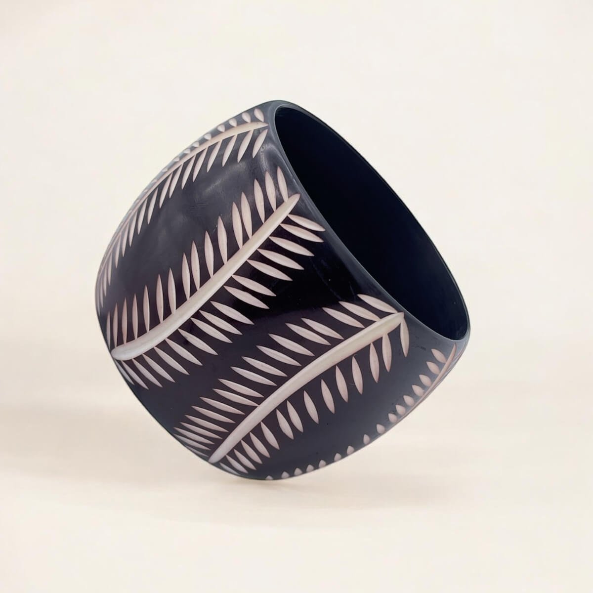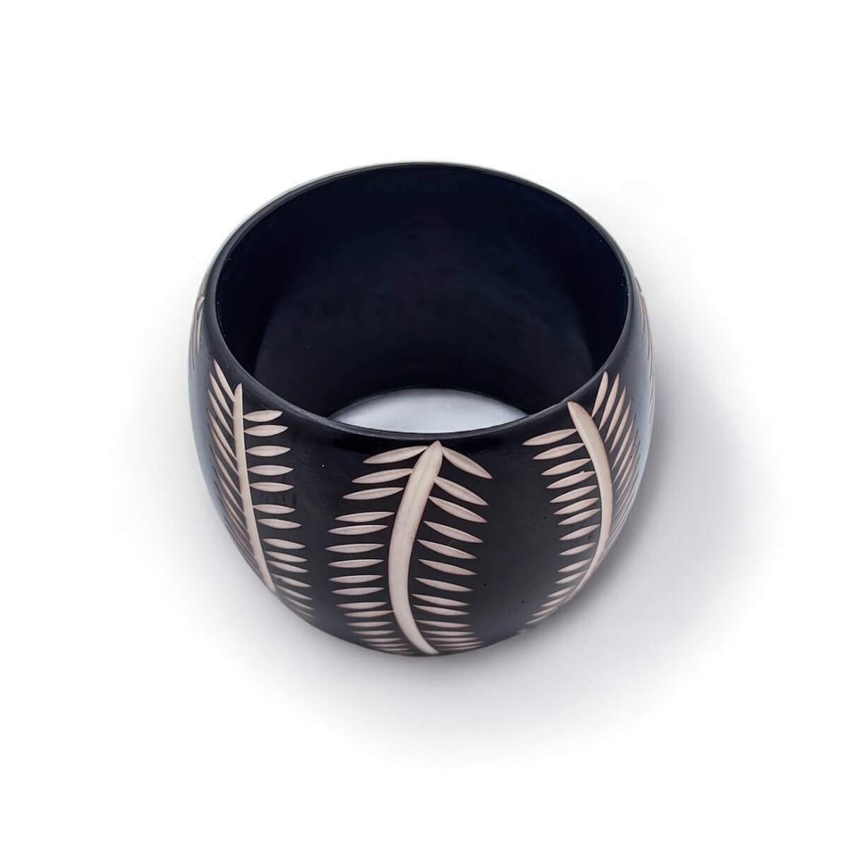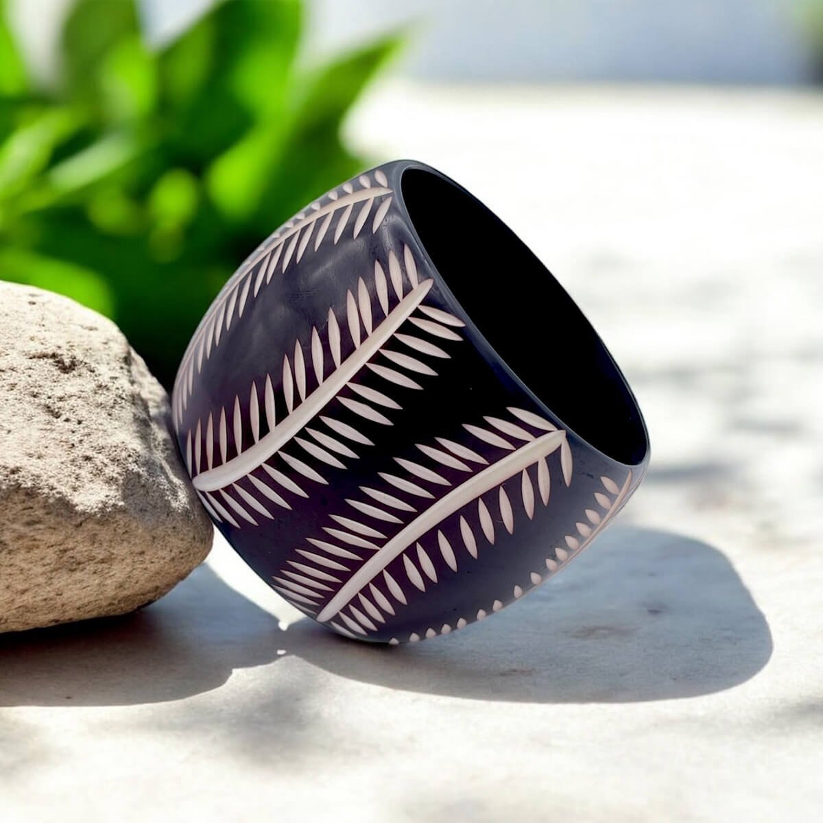 Black Resin Bangle with Engraved Fronds – Tropical Boho Statement Bracelet