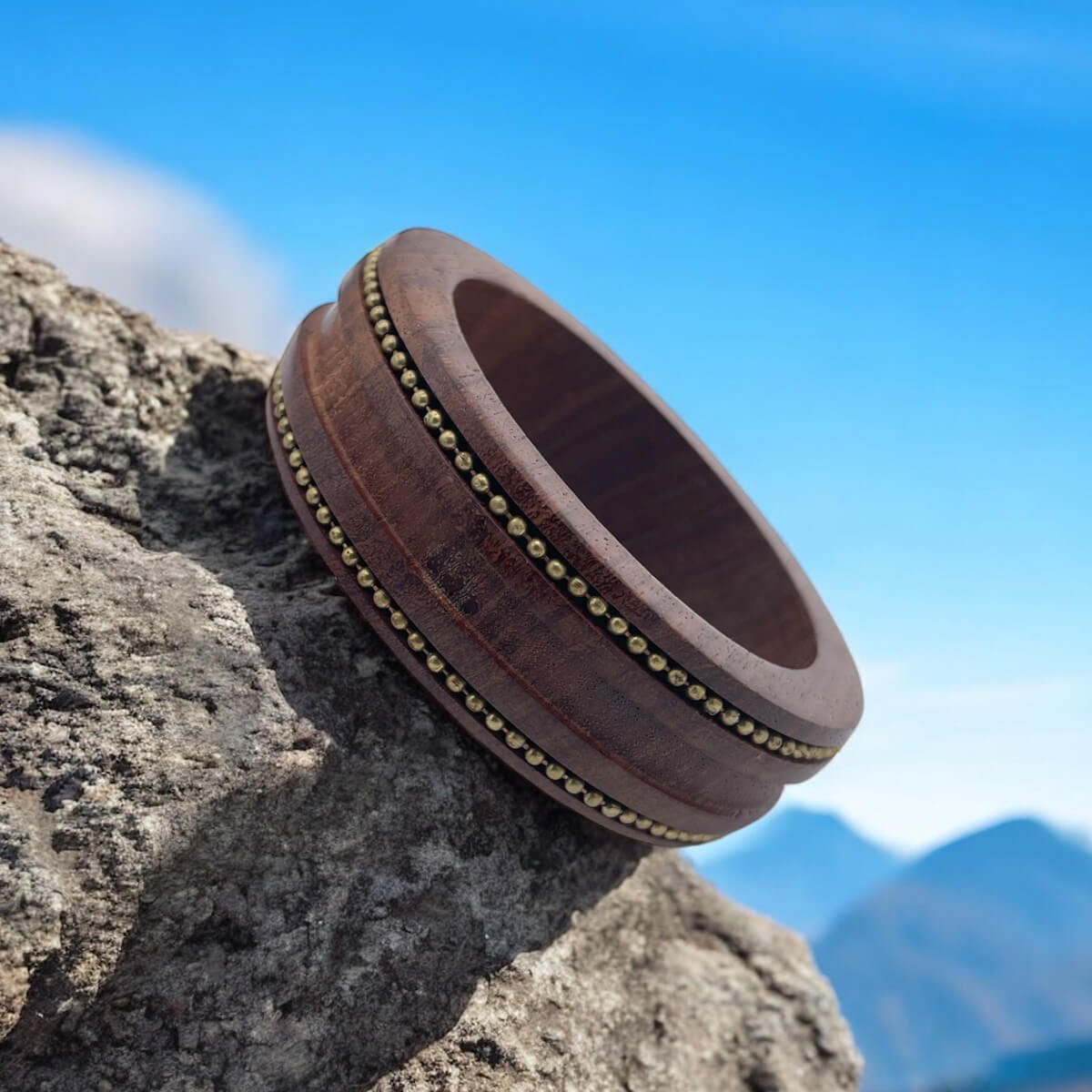 Dark Wood Bangle with Brass Bead Rows – Rustic Bohemian Bracelet