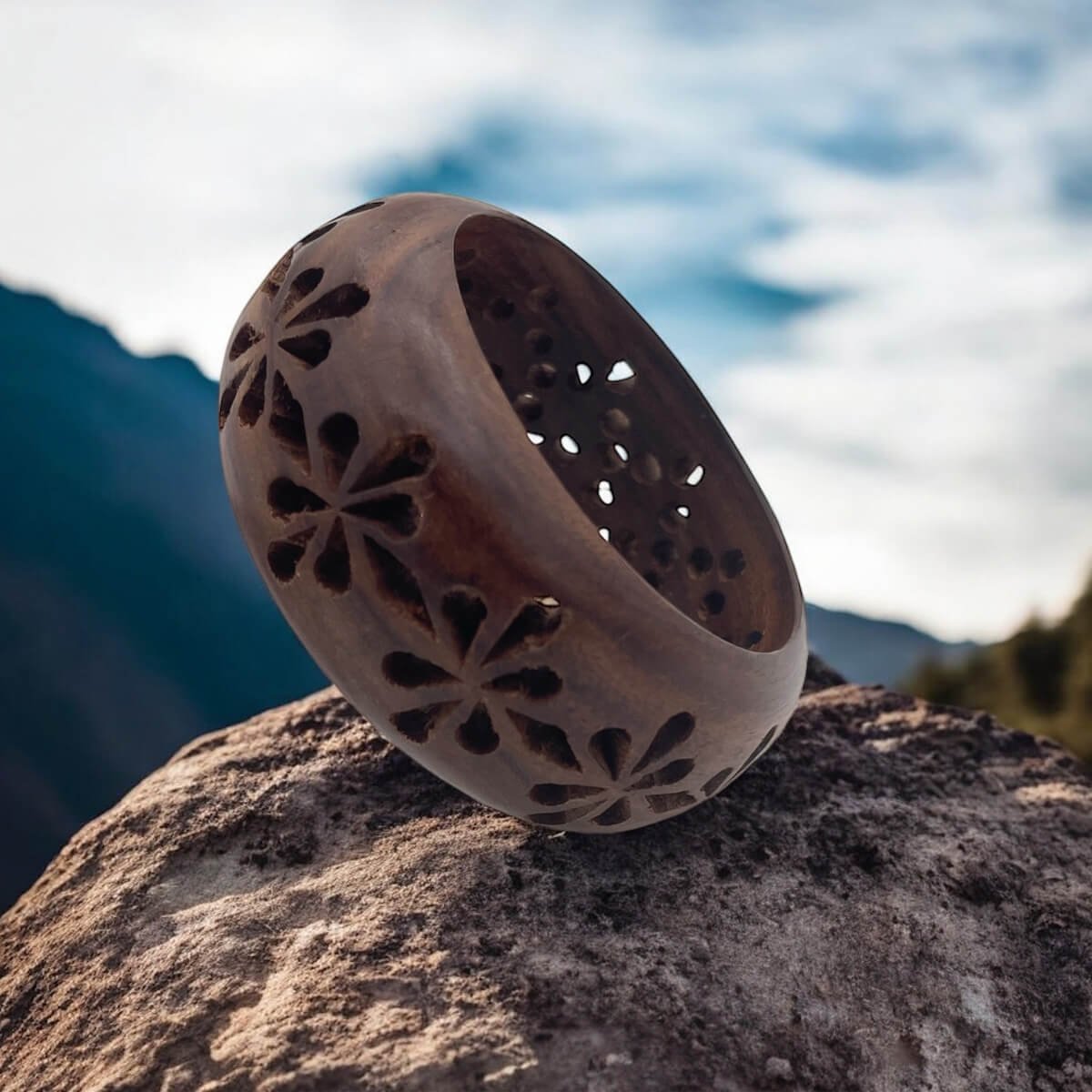Dark Wood Bangle with Floral Cut-Outs – Ornate Bohemian Bracelet