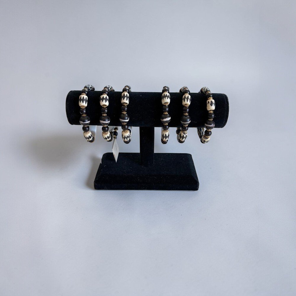Featuring patterned accent beads with a tribal-inspired design, this piece blends earthy tones with a modern edge. The contrast of deep black beads and creamy ivory details makes it easy to pair with both casual and dressed-up looks.