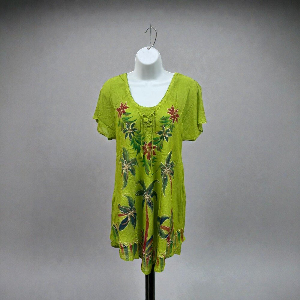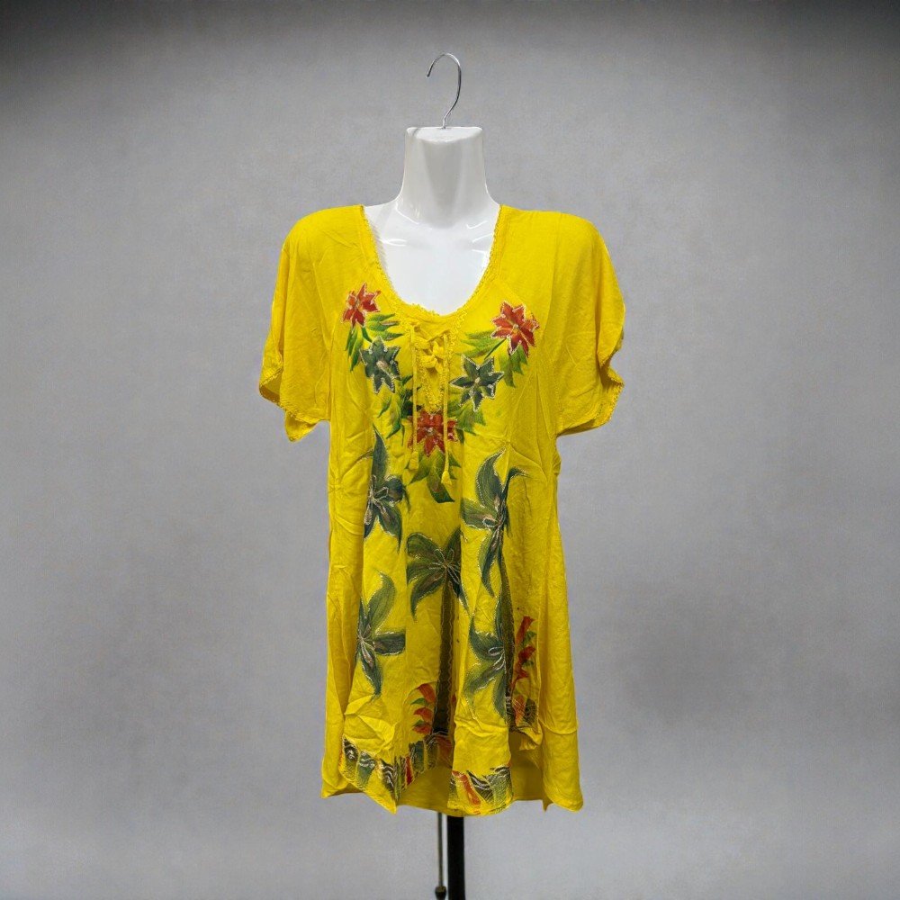 Each top features vibrant floral-inspired patterns with intricate detailing across the front, paired with a soft, airy fabric that drapes beautifully. The relaxed cut and lace-up neckline create a flattering, easy-to-wear silhouette perfect for warm weather or layering year-round.