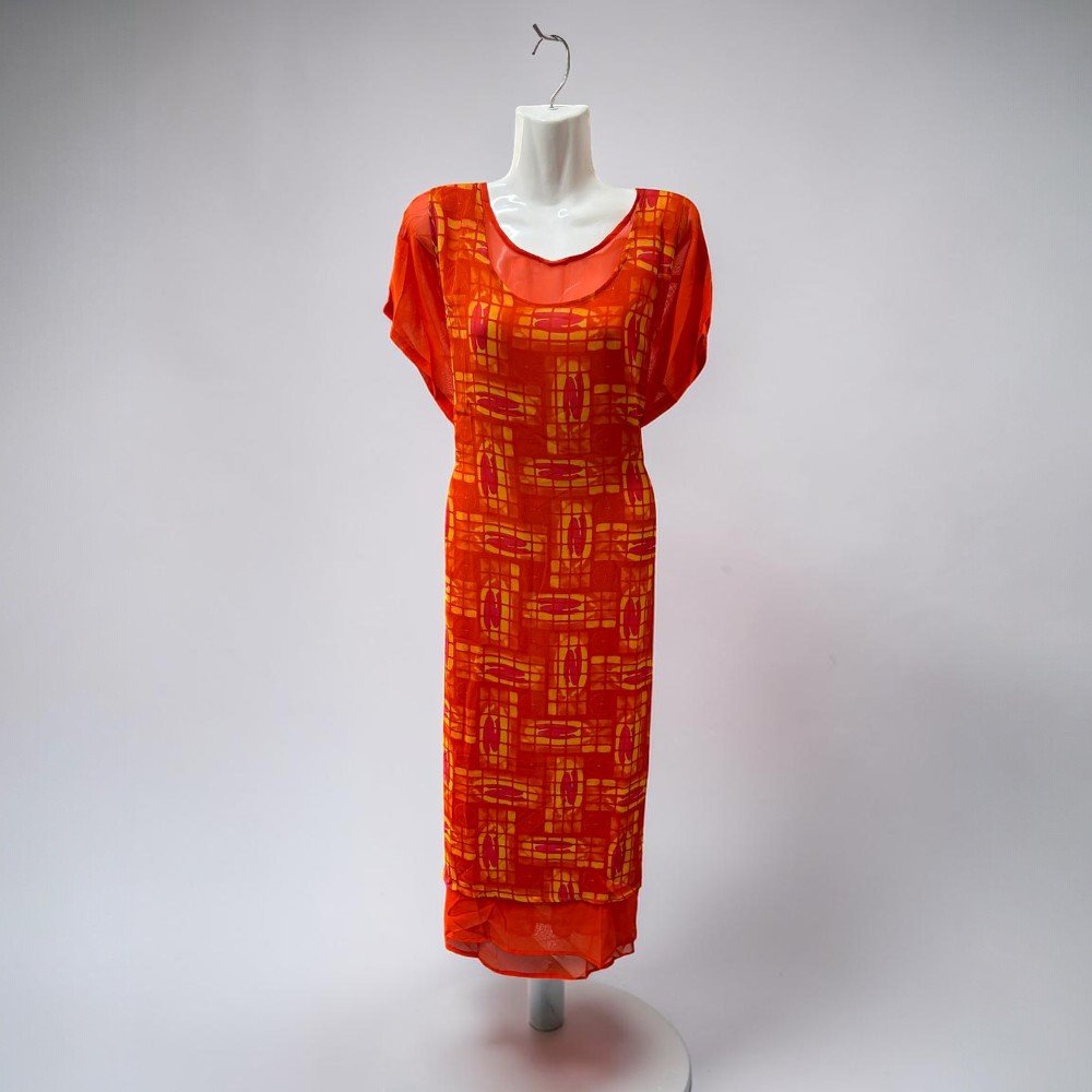 - Bright orange with playful graphic print