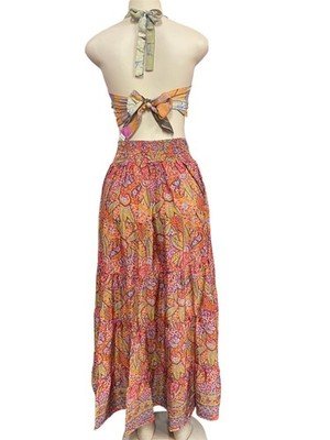 Immerse yourself in exotic charm and artisanal elegance with our printed silk top and skirt set, direct from the workshops of India. As a backdrop for designs inspired by traditional Hindu motifs, creating a combination of colors and patterns that reflect cultural richness and bohemian style. Crafted with care and attention to detail, this set incorporates the softness and fluidity of silk to offer you effortless comfort and style.