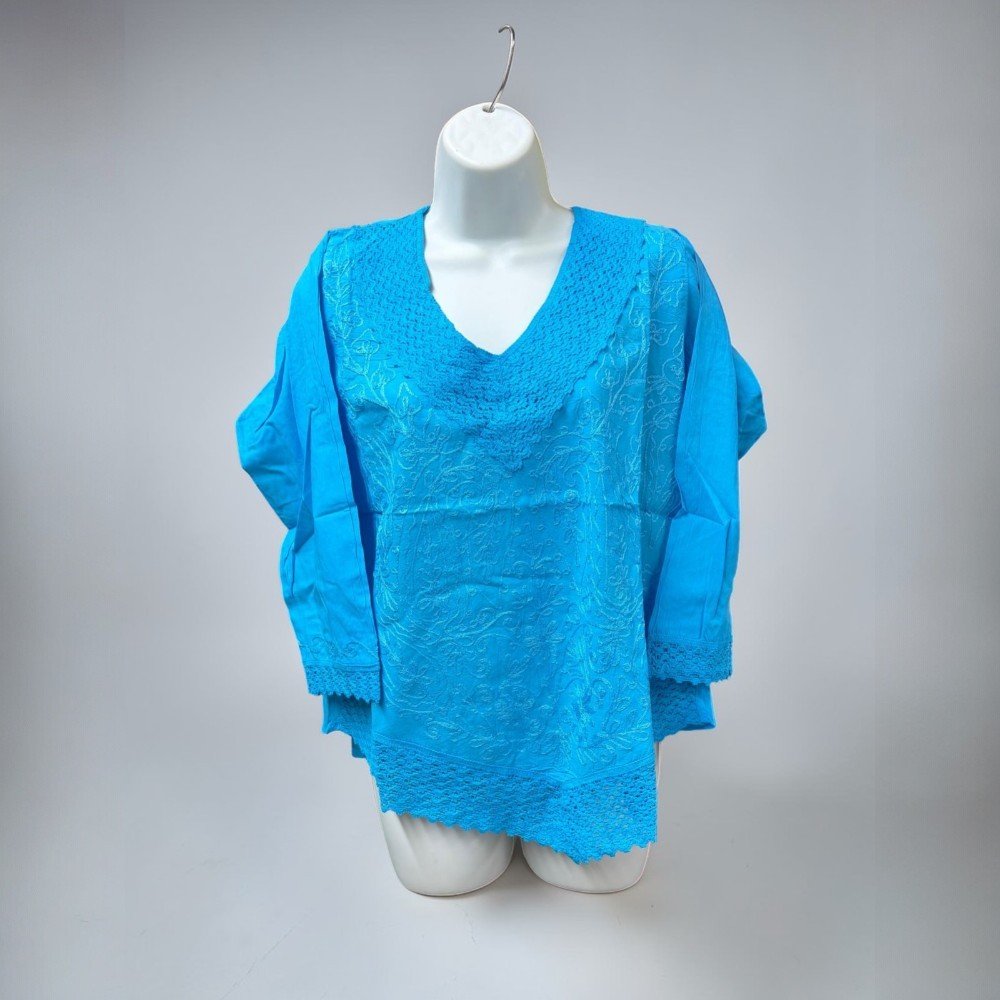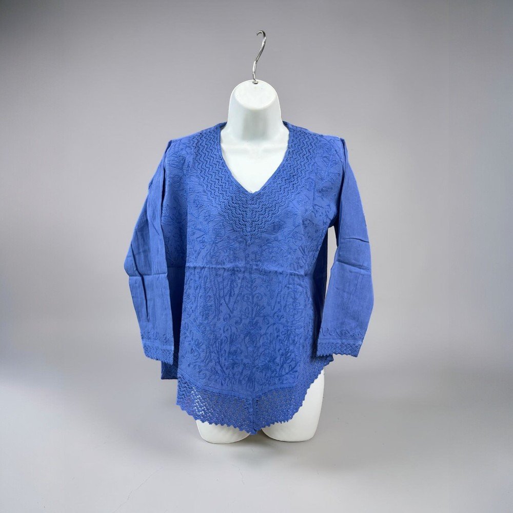 The lightweight fabric feels soft and breathable, making it perfect for year-round wear. Featuring long sleeves and delicate lace trim along the hem, this blouse offers a relaxed silhouette that pairs beautifully with jeans, skirts, or leggings.