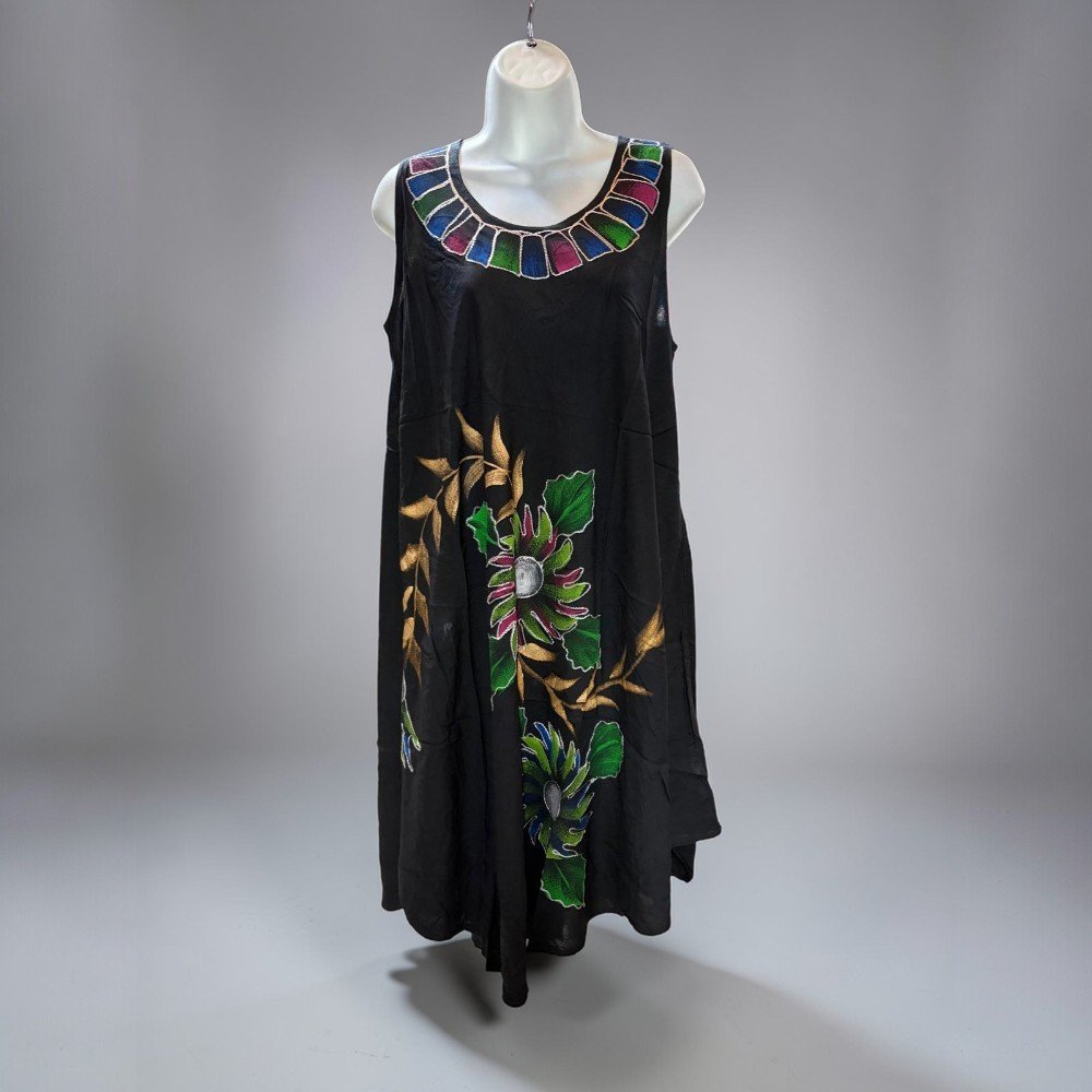 This bohemian A-line dress blends comfort with artistic flair. Featuring bold floral artwork and a colorful decorative neckline, this piece adds personality to any casual wardrobe. The dark base color makes the vibrant details stand out beautifully, creating a unique look that feels both relaxed and stylish.