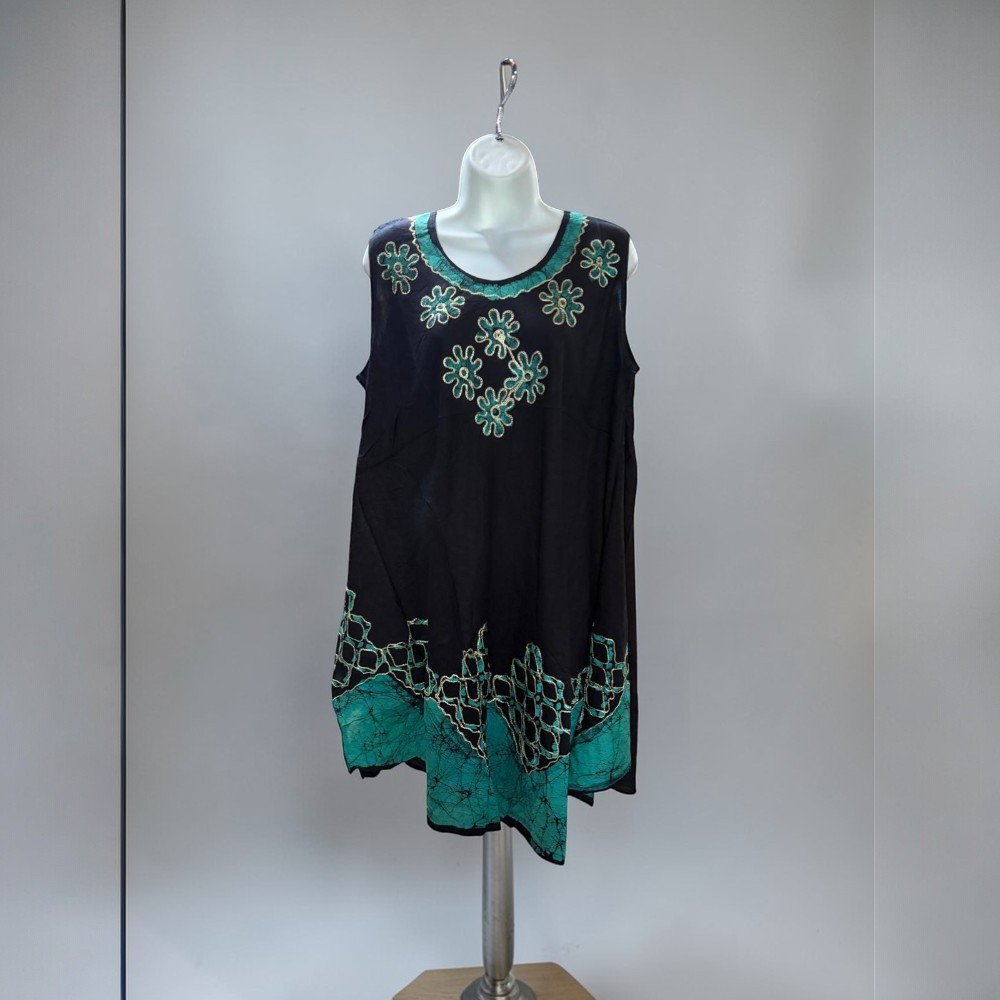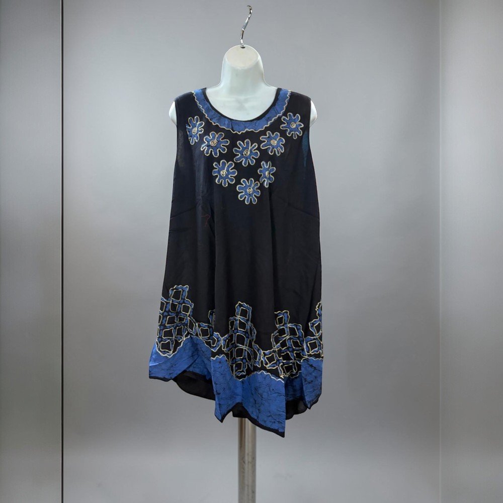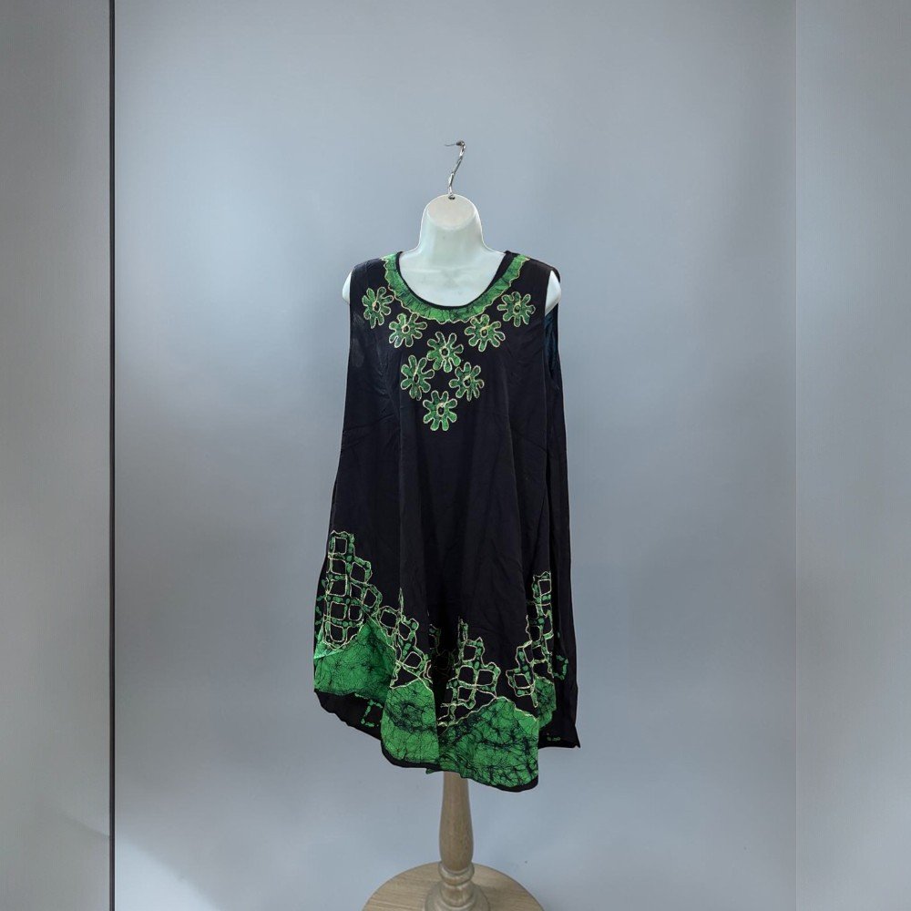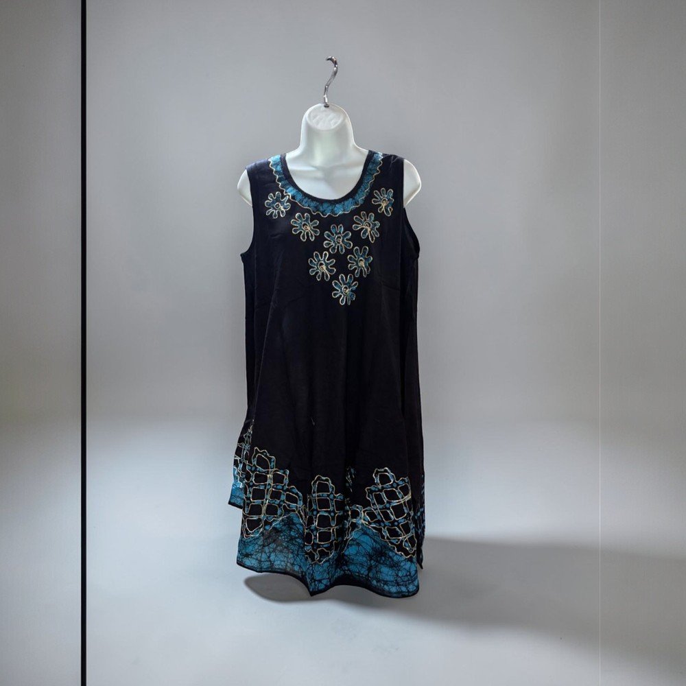 The loose, draped shape allows for easy movement, making it a great choice for warm weather, travel, beach days, or laid-back weekend outfits. The sleeveless design keeps the dress breathable, while the unique pattern detailing adds a touch of character to the overall look.