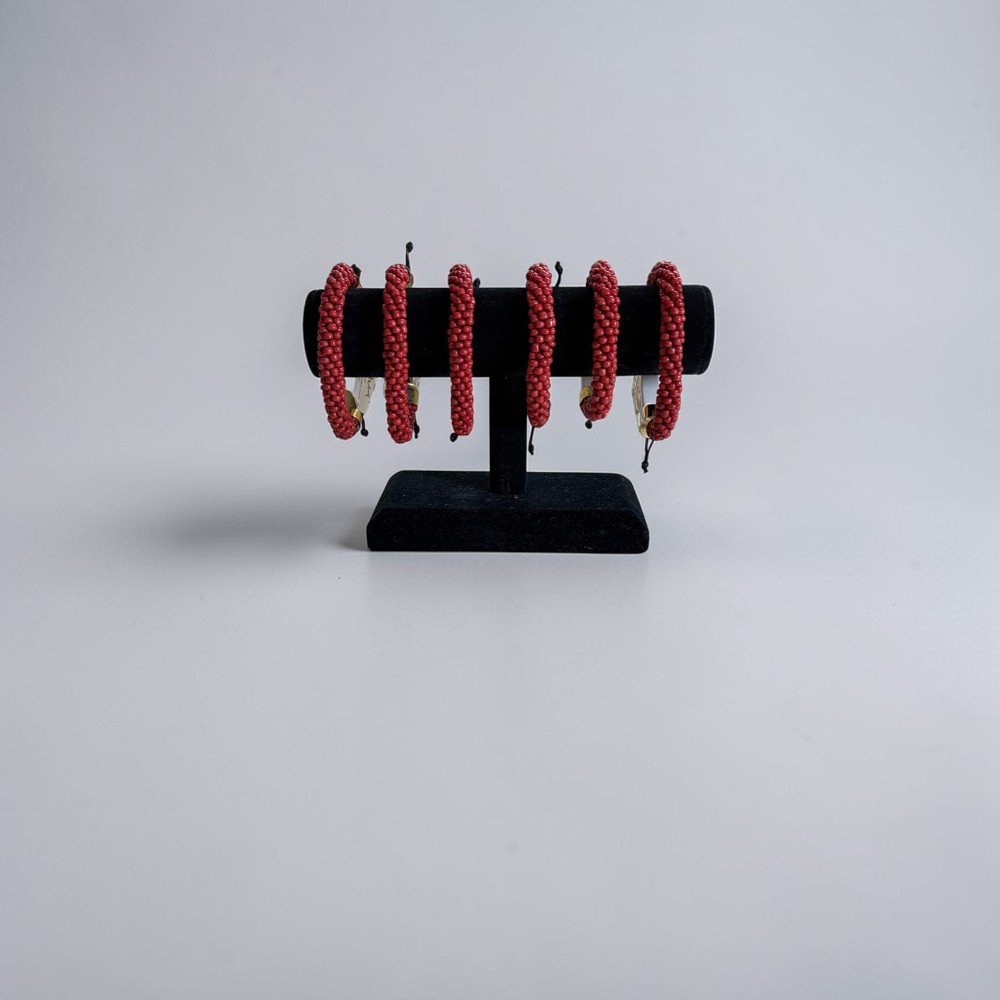 Featuring tightly woven rows of rich red beads, this bracelet has a textured, dimensional look that stands out beautifully on the wrist. Its flexible, adjustable design ensures a comfortable fit while giving it a relaxed, bohemian feel.