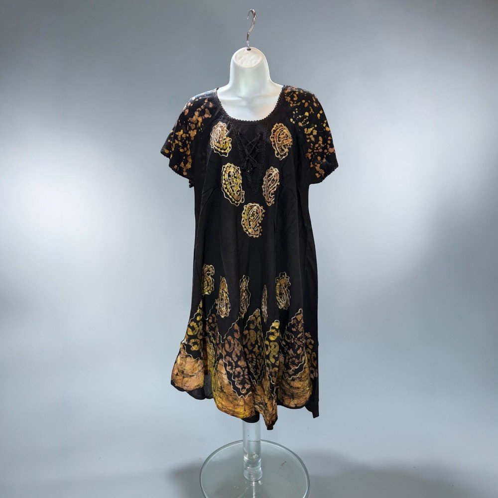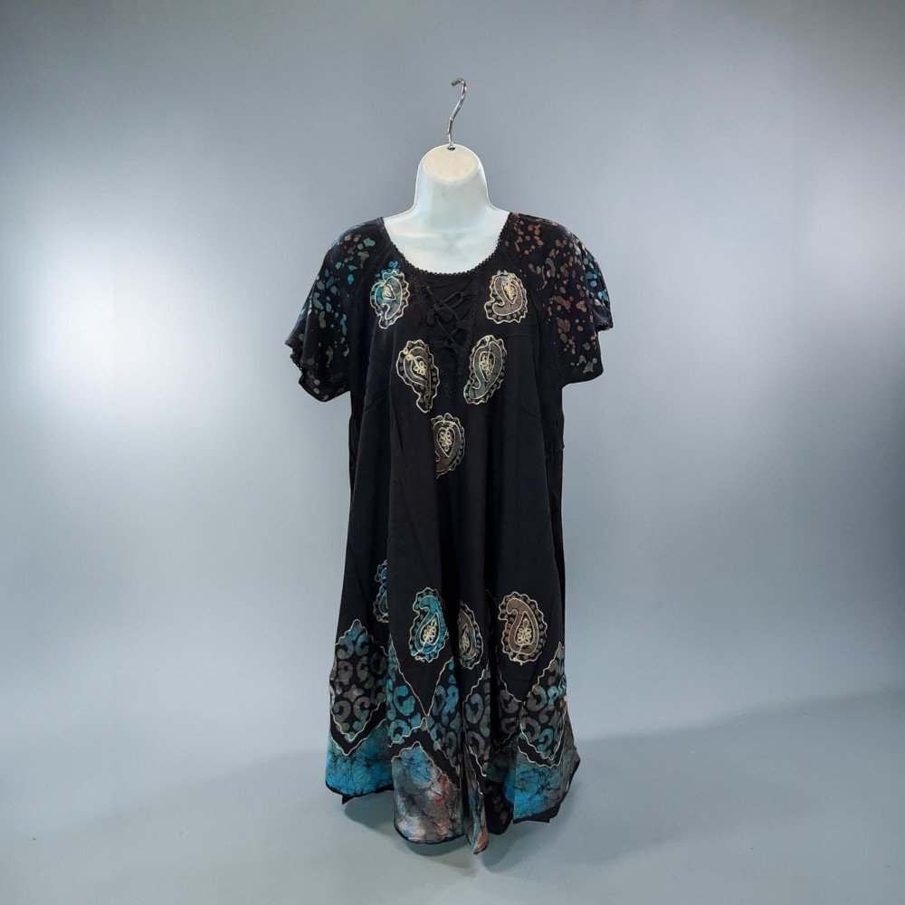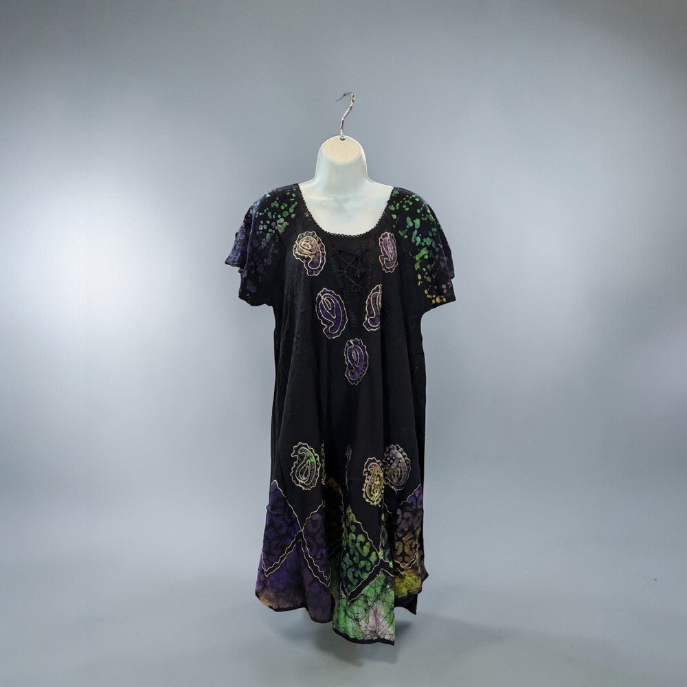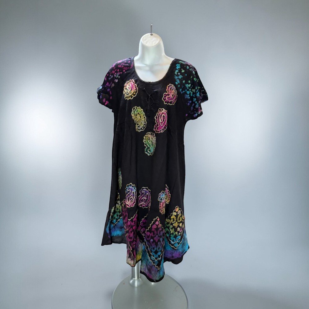 Express your style with this vibrant bohemian tunic dress, featuring colorful paisley-inspired patterns and a relaxed flowing silhouette. The rich mix of colors against the dark background creates a bold artistic look that makes this dress stand out.