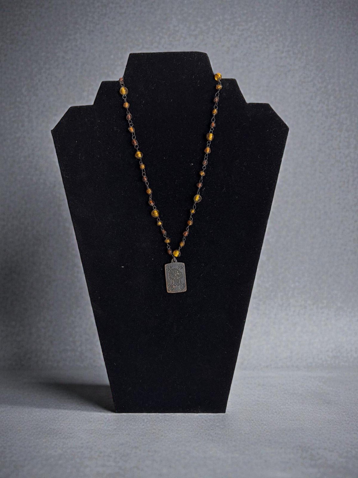 Featuring warm-toned beads paired with a subtle engraved pendant, this piece blends rustic charm with a modern, understated design. The rich browns and golden hues of the beads create a natural look that works with any wardrobe.