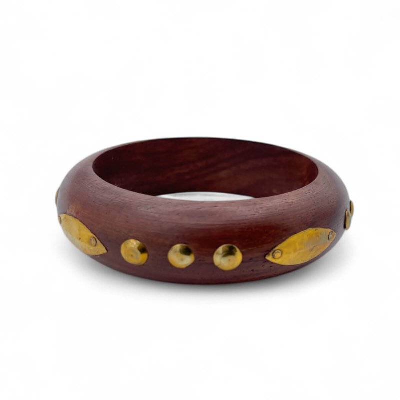 Handcrafted Boho Wooden Bangle with Brass Stud Accents – Natural Dark Wood Statement Bracelet